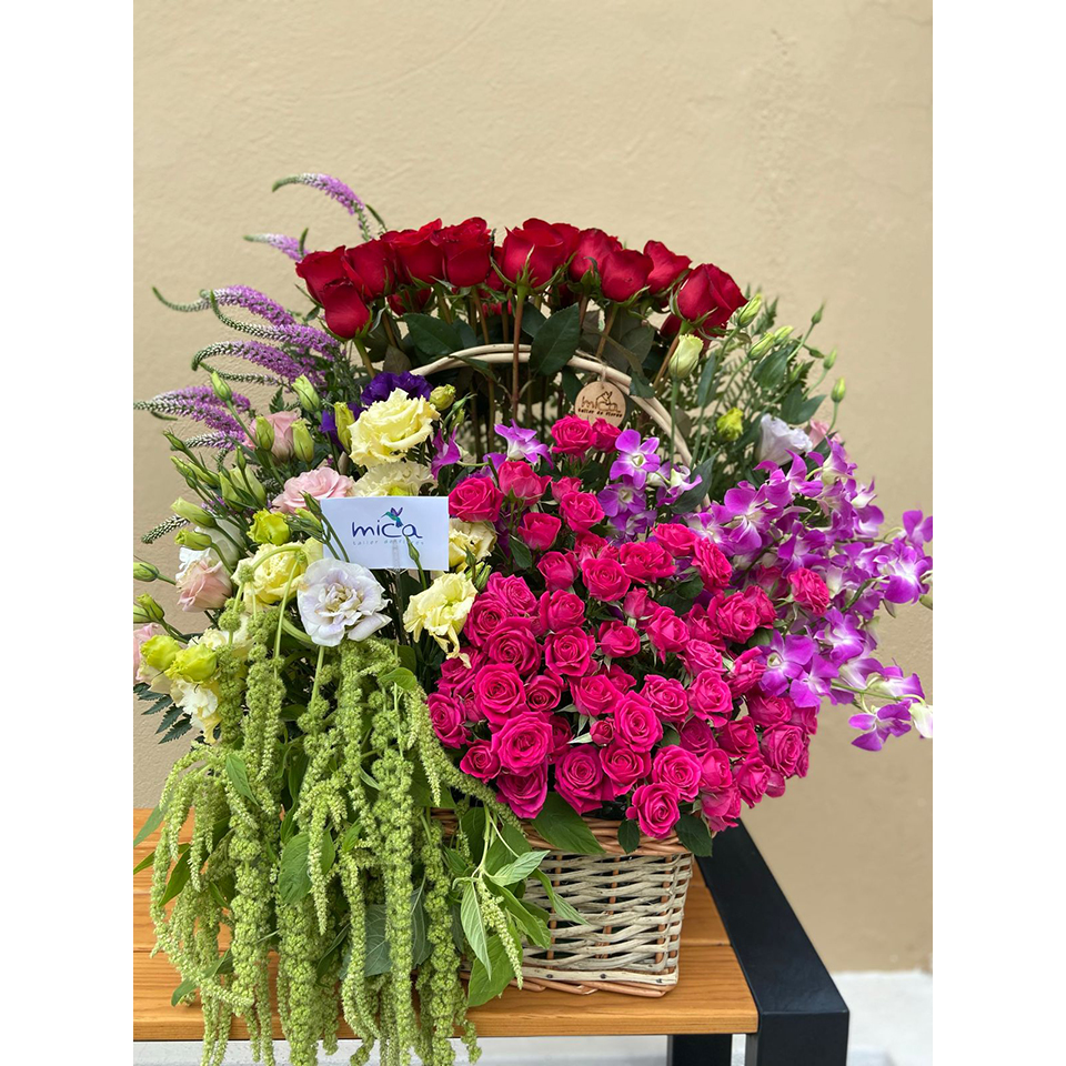 Base canasta cuadrada de mimbre con mini rosa, rosa, lisianthus, verónica, amaranto y dendrobium.