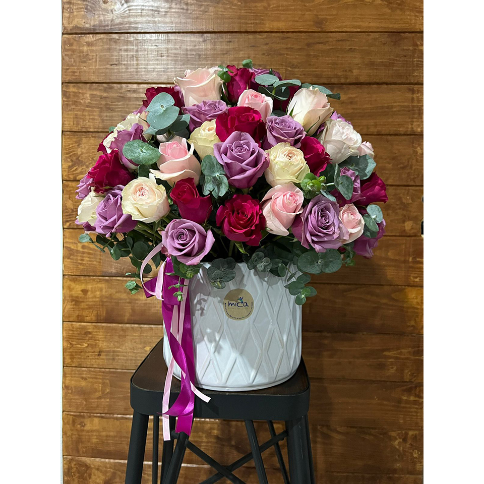 Base de cerámica blanca con mix de rosas y eucalipto.